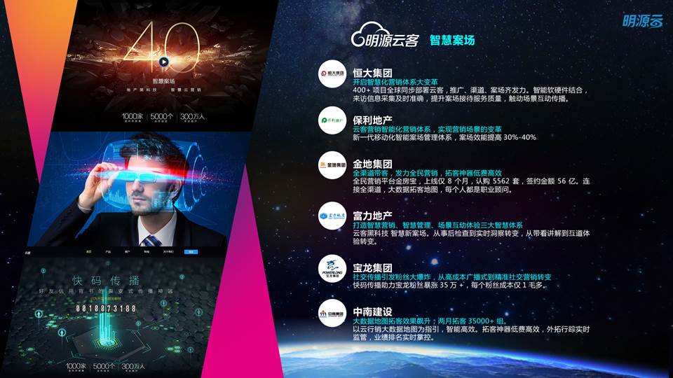 云客,通过引入黑科技全面升级传统售楼处,结合智能软硬件应用,重构地产营销场景,为房地产企业打造智慧营销、智慧管理、场景互动体验三大智慧体系,实现传统案场的智慧化转型。云客已经与1000家开发商合作,走进了7000个案场。