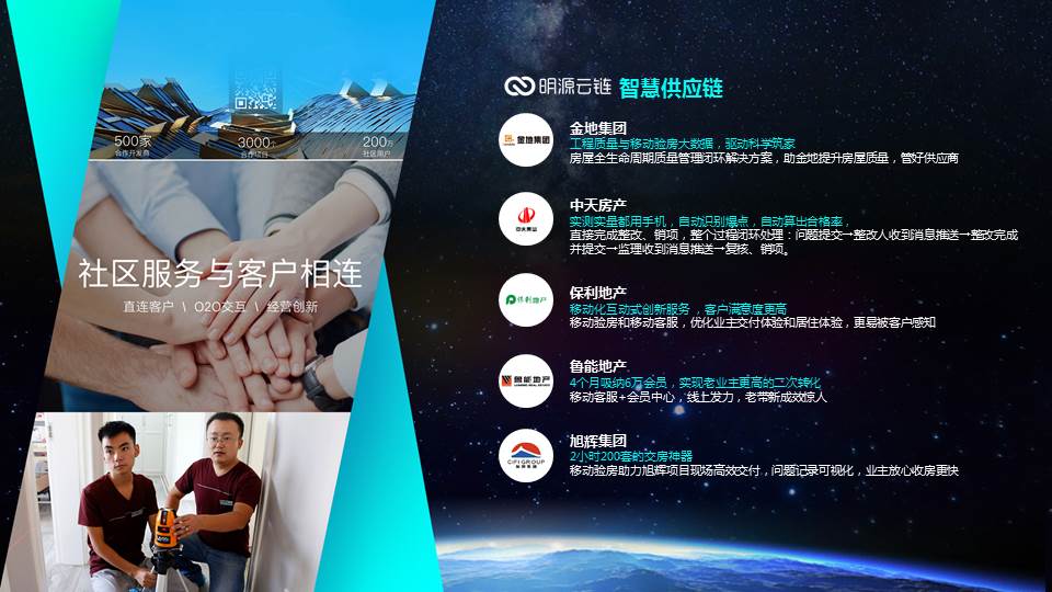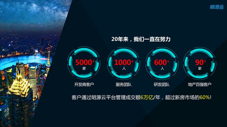 经过十几年的努力,明源在智慧供应链、智慧经营、智慧营销、智慧空间运营、地产大数据等方面,占据绝对领导地位。